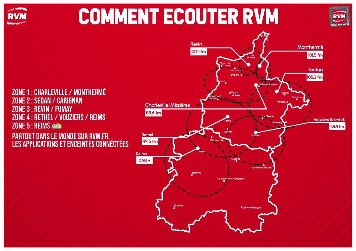 Sur la FM à Charleville-Mézières - 88.6 FM / Sedan - 105.3 FM / Monthermé 101.5 FM / Revin - 107.1 FM / Rethel - 99.5 FM / Vouziers (bientôt) - 101.9FM / Reims - DAB+